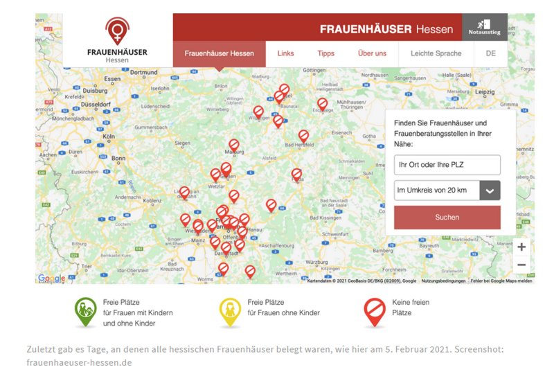 Von November 2020 bis Januar 2021 wertete das journalistische Recherchezentrum Correctiv.org in Zusammenarbeit mit lokalen Medien und buzzfeednews täglich die Belegungsdaten der Frauenhäuser in fünf Bundesländern aus. Das Ergebnis: Die Anforderungen des Europarats und der seit 2018 rechtsgültigen Istanbul-Konvention verfehlt Deutschland weit. Regelmäßig müssen hilfesuchende Frauen abgewiesen werden. Zahlreiche Frauenhäuser waren im Untersuchungszeitraum durchgehend oder an sechs von sieben Wochentagen voll belegt. Eine Befragung von Frauenhaus-Mitarbeitenden bundesweit bestätigt die hohe Be- und Überlastung des Hilfesystems.