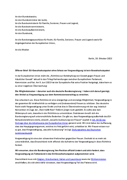 Europäisches Parlament, Kommission und Rat verhandeln derzeit eine neue EU-weite „Richtlinie zur Bekämpfung von Gewalt gegen Frauen und häuslicher Gewalt“. Die Richtlinie gilt u.a. als einzigartige Möglichkeit, Vergewaltigung in der gesamten EU strafrechtlich zu verfolgen und (insbesondere) Frauen zu schützen. Am 9. Juni 2023 haben die Mitgliedsstaaten des europäischen Rats – darunter die deutsche Bundesregierung – sich jedoch darauf geeinigt, den Artikel zu Vergewaltigung aus dem Kommissionsvorschlag zu streichen.