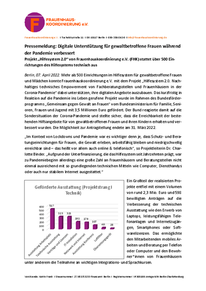 Berlin, 07. April 2022. Mehr als 500 Einrichtungen im Hilfesystem für gewaltbetroffene Frauen und Mädchen konnte Frauenhauskoordinierung e.V. mit dem Projekt „Hilfesystem 2.0. Nachhaltiges technisches Empowerment von Fachberatungsstellen und Frauenhäusern in der Corona-Pandemie“ dabei unterstützen, ihre digitalen Angebote auszubauen. Das kurzfristig in Reaktion auf die Pandemie ins Leben gerufene Projekt wurde im Rahmen des Bundesförderprogramms „Gemeinsam gegen Gewalt an Frauen“ vom Bundesministerium für Familie, Senioren, Frauen und Jugend mit 3,5 Millionen Euro gefördert. Der Bund reagierte damit auf die Sondersituation der Corona-Pandemie und stellte sicher, dass die Erreichbarkeit der bestehenden Hilfsangebote für von gewaltbetroffenen Frauen und ihren Kindern erhalten und verbessert wurden. Die Möglichkeit zur Antragstellung endete am 31. März 2022.