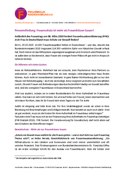 Berlin, 05.03.2020. 14.200 Frauenhausplätze fehlen in Deutschland – und das, obwohl das Bundeskriminalamt 2018 insgesamt 114.393 weibliche Opfer von Häuslicher Gewalt erfasst hat. Noch immer ist das Hilfesystem ungenügend ausgebaut und chronisch unterfinanziert. Es ist außerdem so hürdenreich, dass Frauen die wenigen freien Plätze oft gar nicht in Anspruch nehmen können.