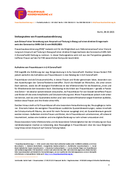 FHK begrüßt die Einführung der sog. Bürgerstestung in § 4a CoronaTestV. Das besonders hohe Infektionsrisiko und die besonderen Schwierigkeiten bei der Umsetzung von Quarantänekonzepten machen es notwendig, dass Neuzugänge in Frauenhäusern über die neue Bürgertestung hinaus einen Anspruch auf Corona-Testung haben. Daher fordert FHK weiterhin die Aufnahme von Frauenhäusern in den Katalog der in § 4 CoronaTestV.