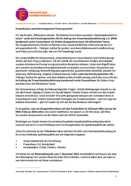 Rückfragen zur Studie können Sie an Hanna Kopahnke (kopahnke(at)frauenhauskoordinierung.de) und an Dr.in Ines Pohlkamp vom Forschungsinstitut tifs (pohlkamp(at)tifs.de) stellen.