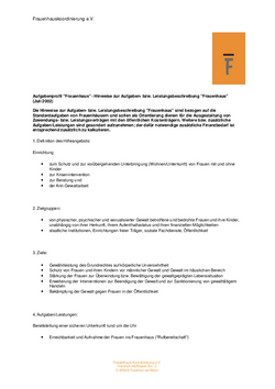 Die Hinweise zur Aufgaben- bzw. Leistungsbeschreibung "Frauenhaus" sind bezogen auf die Standardaufgaben von Frauenhäusern und sollen als Orientierung dienen für die Ausgestaltung von Zuwendungs- bzw. Leistungsverträgen mit den öffentlichen Kostenträgern. Weitere bzw. zusätzliche Aufgaben/Leistungen sind gesondert aufzunehmen; der dafür notwendige zusätzliche Finanzbedarf ist entsprechend zusätzlich zu kalkulieren.