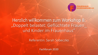 Herzlich willkommen zum Workshop 8: „Doppelt belastet: Geflüchtete Frauen_ und Kinder im Frauenhaus” Referentin: Sarah Sobeczko Fachforum 2020 Ablauf Workshop 8 • Block I: Input Projektvorstellung…
