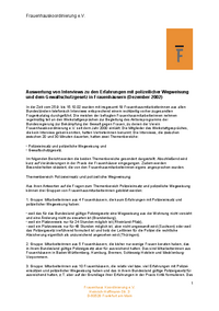 In der Zeit vom 25.9. bis 15.10.02 wurden mit insgesamt 19 Frauenhausmitarbeiterinnen aus allen Bundesländern telefonisch Interviews mit einem vorher zugesandten Fragenkatalog durchgeführt.